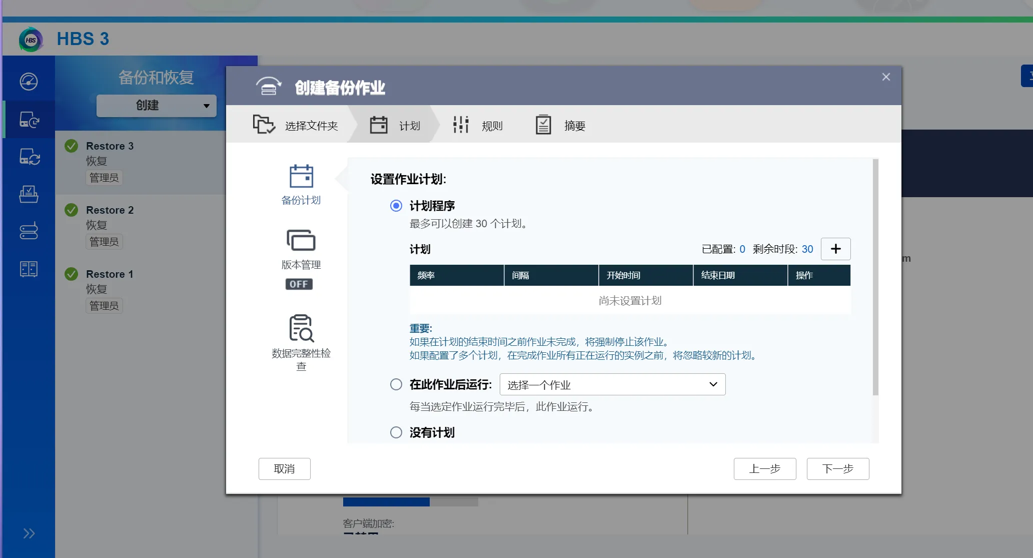 同时可以设定作业计划,比如每周进行、每月进行等等,还可以启用数据完整性校验保证数据一致性,还有版本管理等功能,同时可以导出备份日志,设定过滤策略等等。